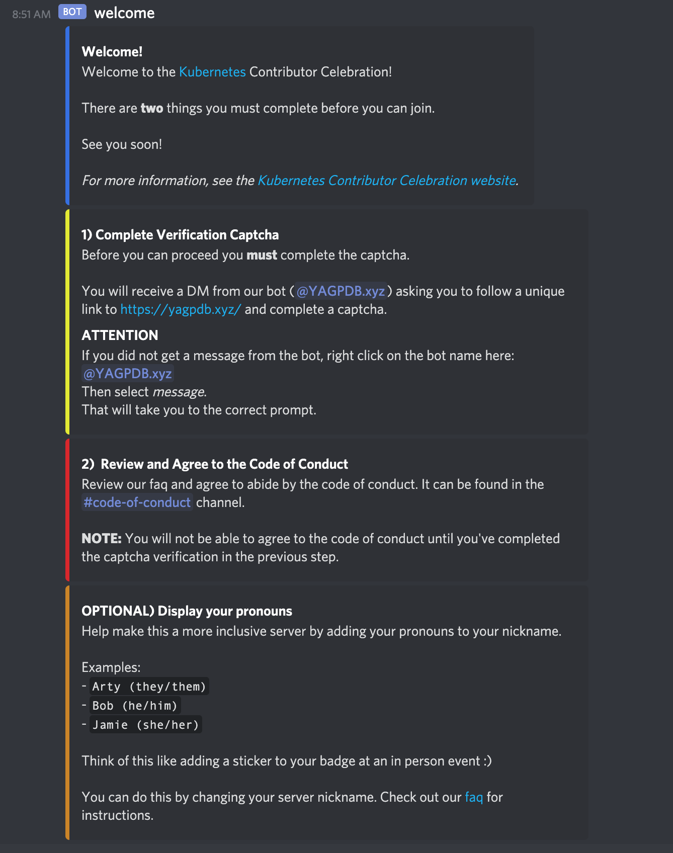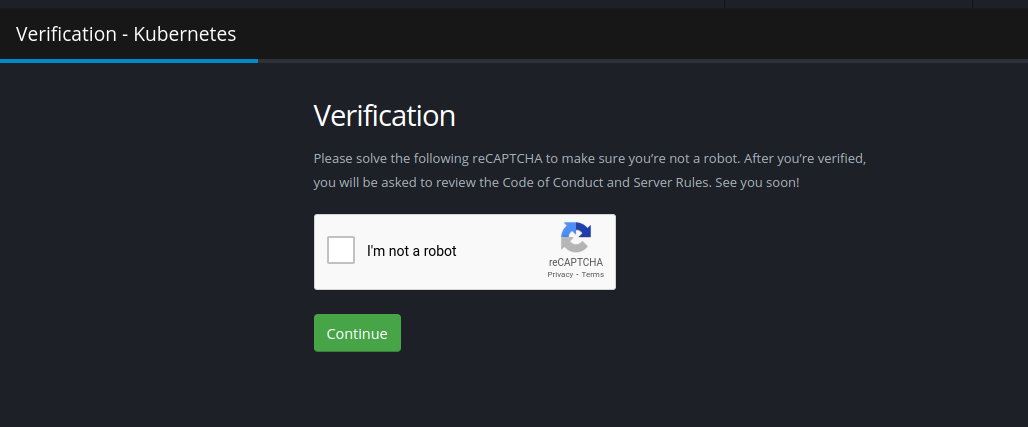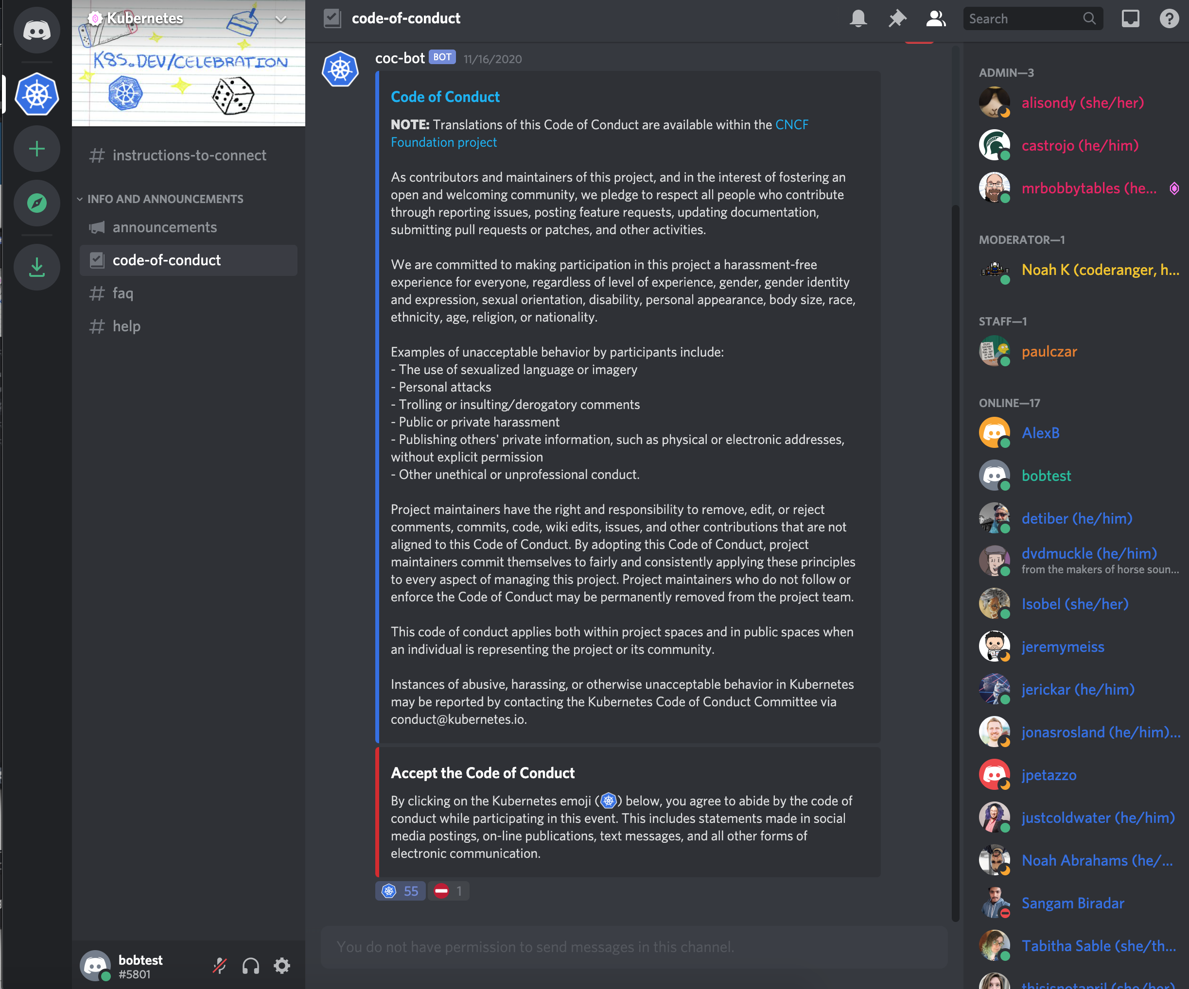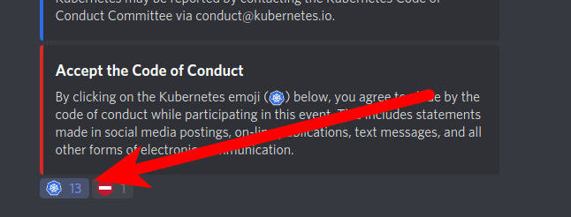 5. After completing the captcha, navigate to the #code-of-conduct channel. There you will need to read and agree to the Code of Conduct by clicking on the Kubernetes emoji. This must be done before you can access any other channels within the server.