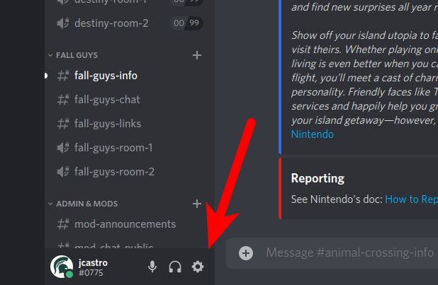 1. Begin by clicking on the cog next to your Discord username in the lower left corner: