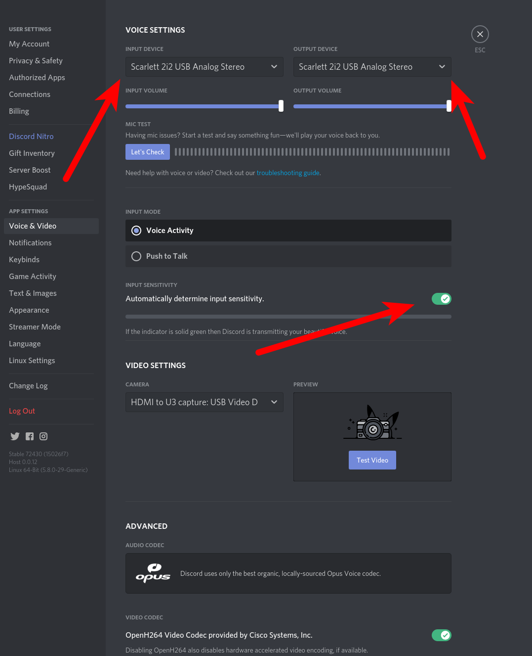 2. Navigate to the Voice & Video section of the User Settings to adjust your inputs and outputs.